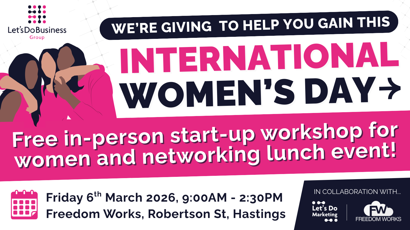 This International Women’s Day 2026 business support event is proudly delivered by Let’s Do Business Group, in collaboration with Let’s Do Marketing and Freedom Works, bringing together expertise, community, and shared values to support women in business.